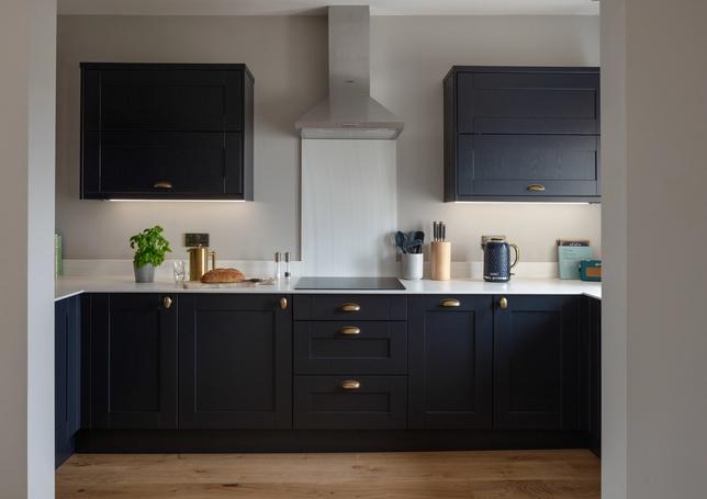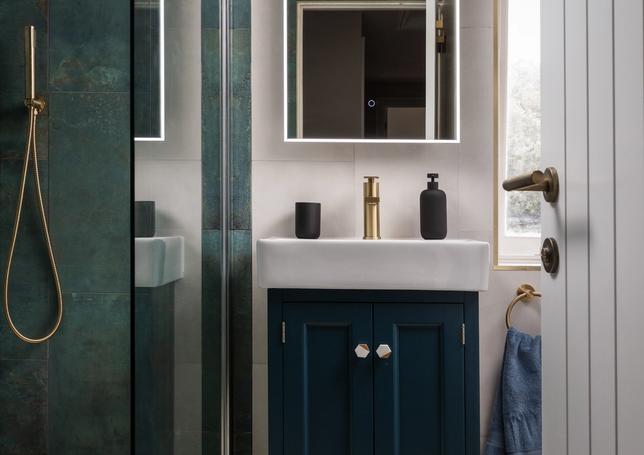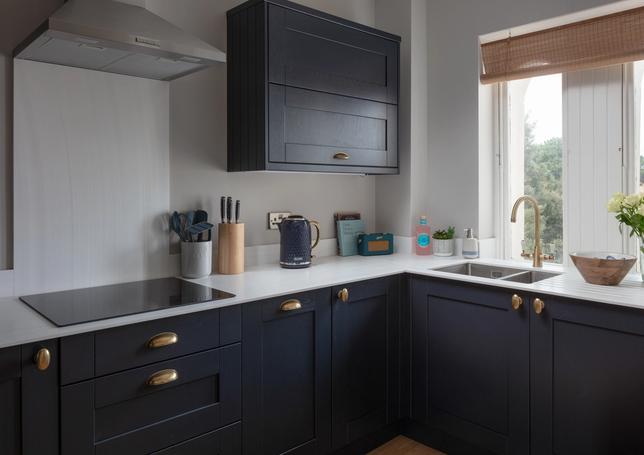 Both brand new kitchen and bathroom suites - with tones of the blue and brass fixtures to create cohesion throughout the apartment.