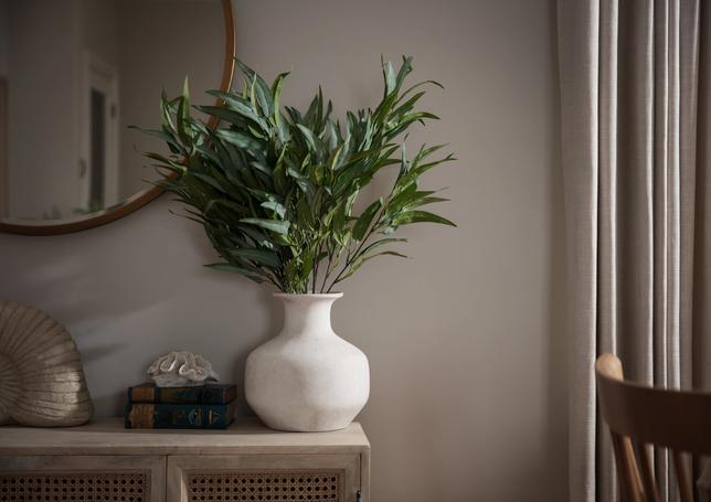 Mixing the dark blue with warm grey hues, we lightened the rooms and used simple voile fabric for a gentle underlay, complimented with a soft almond curtain.